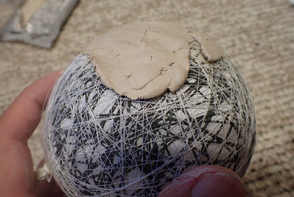 表面が乾いたら、焼き物用粘土を糸の間に塗りこんでいく。